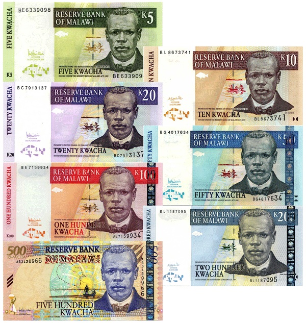 Bank notes include MWK500, MWK200, MWK100, MKW50, MKW20, MKW10 and MWK5.